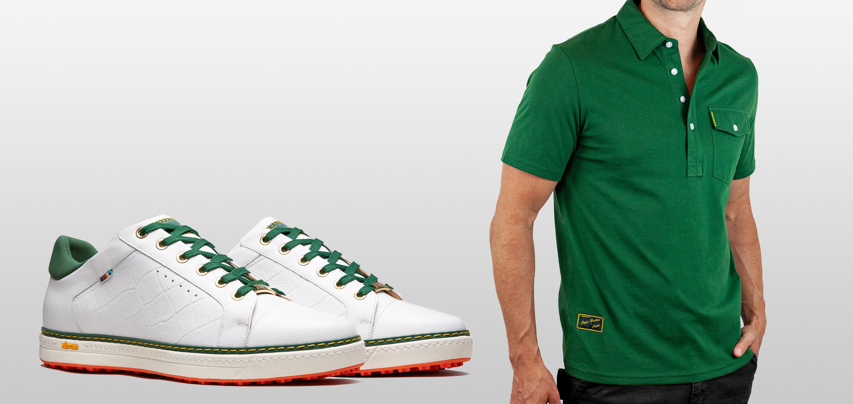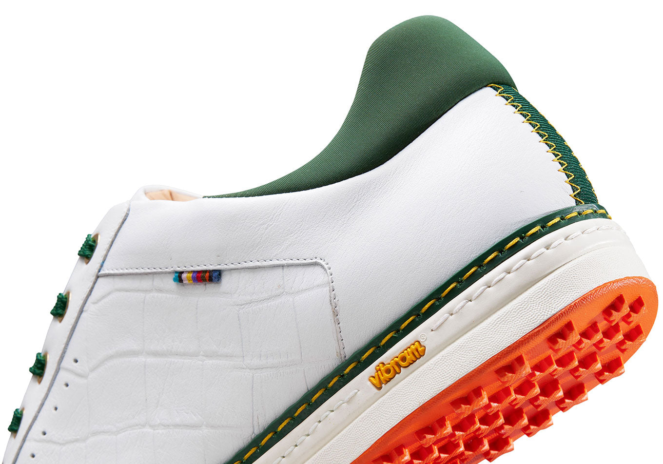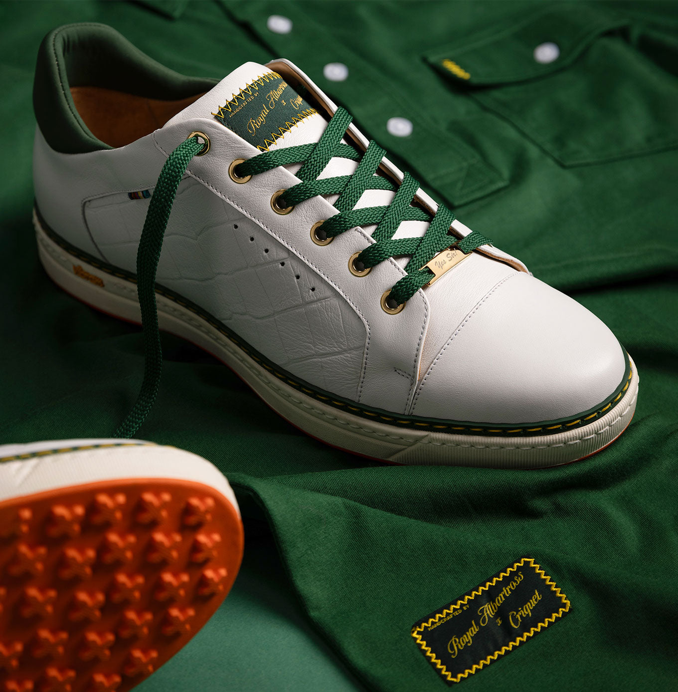 Our Iconic Bond golf shoe in white croc-print Italian Napa leather seemed the perfect canvas to introduce bold highlights in green, gold and yellow, inspired by a prestigious event and an extraordinary accomplishment in the world of golf.