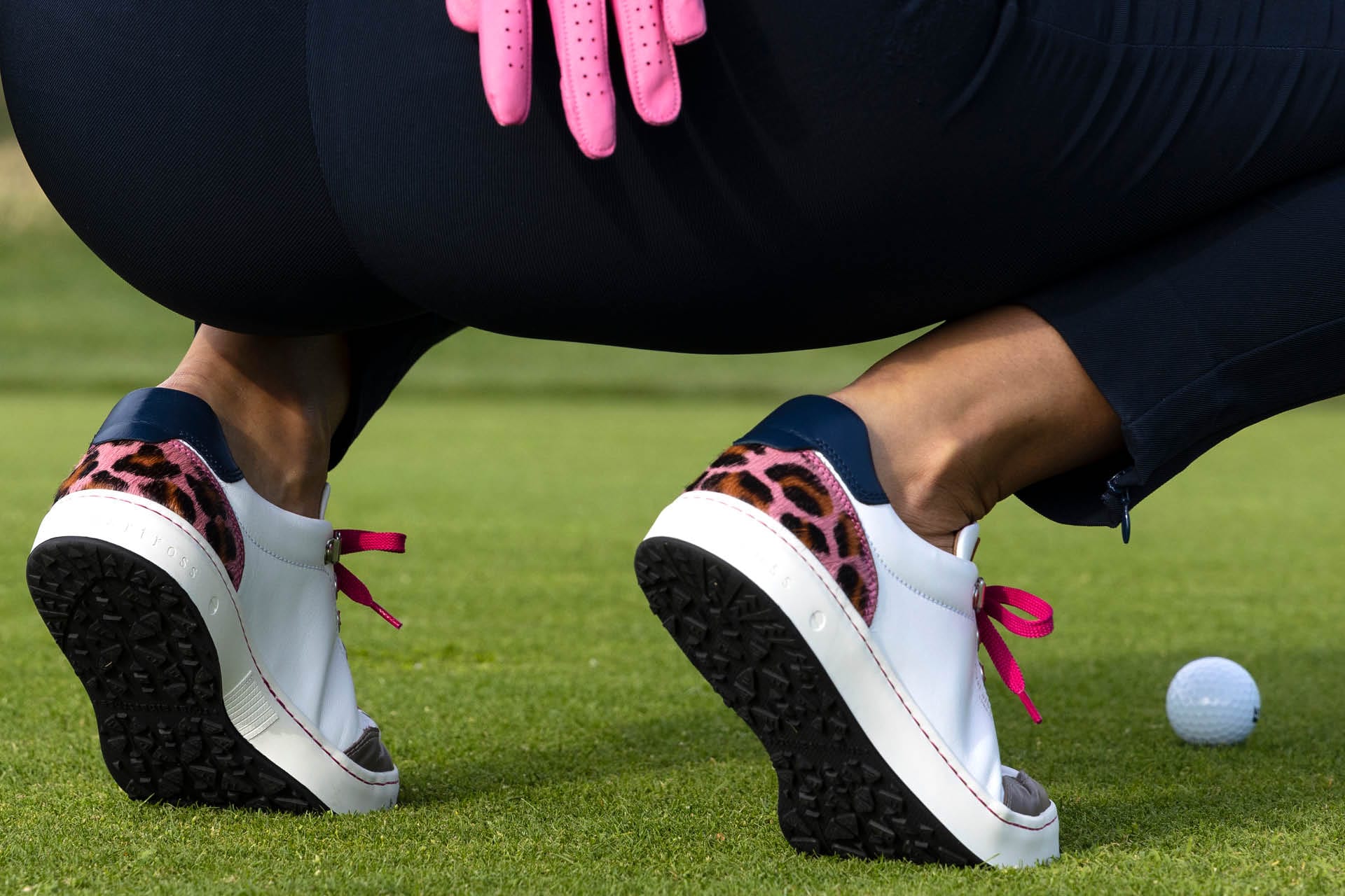 A playful performer. The Fieldfox Pink Leopard proves that fun and function can get along just fine. The vibrant pink leopard hair-on print and soft Italian white leather and suede uppers will turn heads on the tee. But the foundation is our custom LOX-01 outsole, delivering ultra-light traction for superb on-course control.