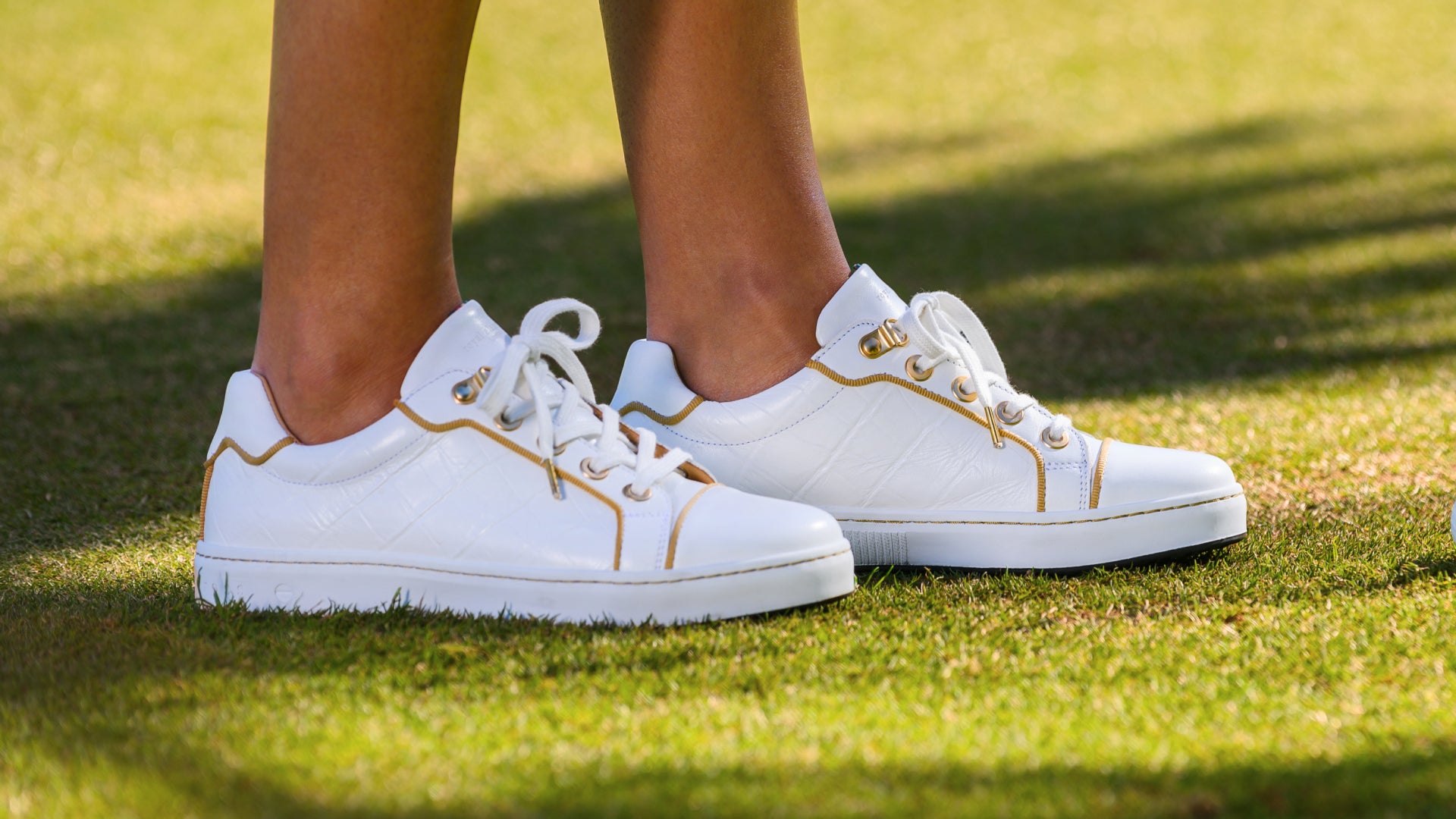 Women's Croc Print White & Gold Spikeless Golf Shoe.