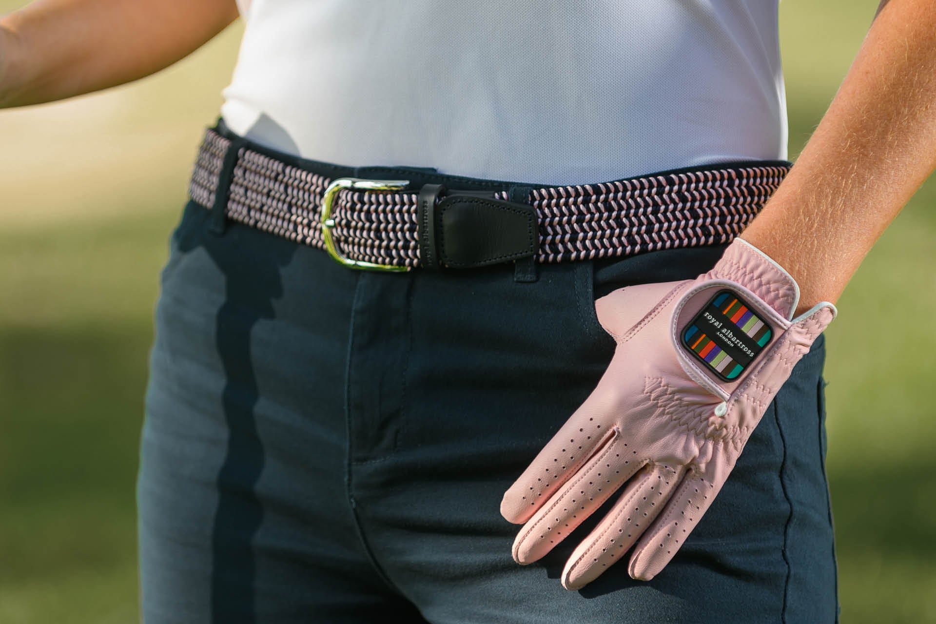 Italian braided elastic provides unparalleled flexibility, while European leather trim adds a touch of elegance. The nickel-free, palladium coated, solid brass buckle is hand finished, ensuring every swing is an expression of self and athleticism.