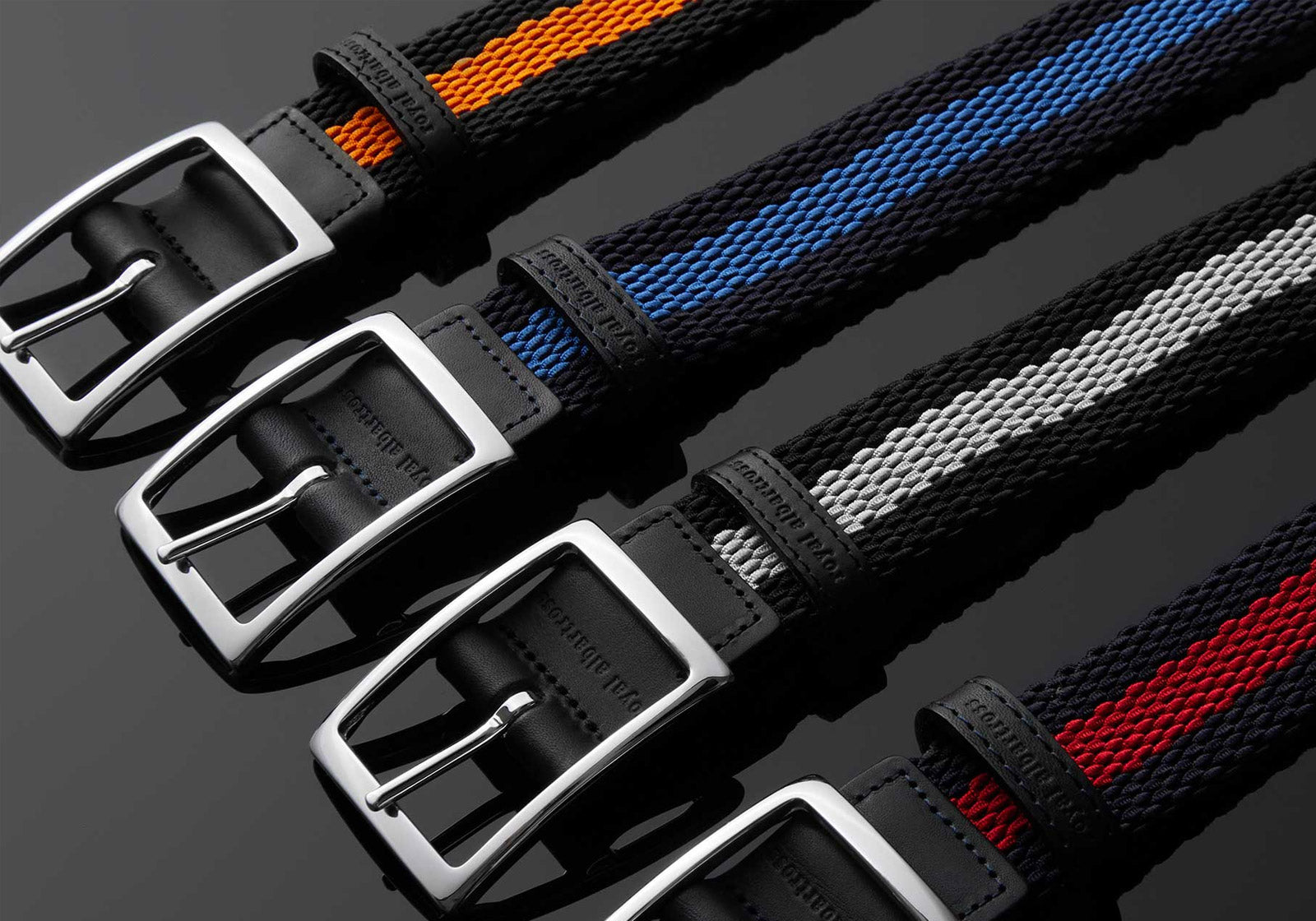 Durable Italian navy blue woven rayon with a contrasting red stripe for a bold look. The woven elasticized construction improves fit and comfort, finished with a leather end tab and stylish square brass buckle. The Oxford is fully reversible, with a solid navy blue surface on the underside.