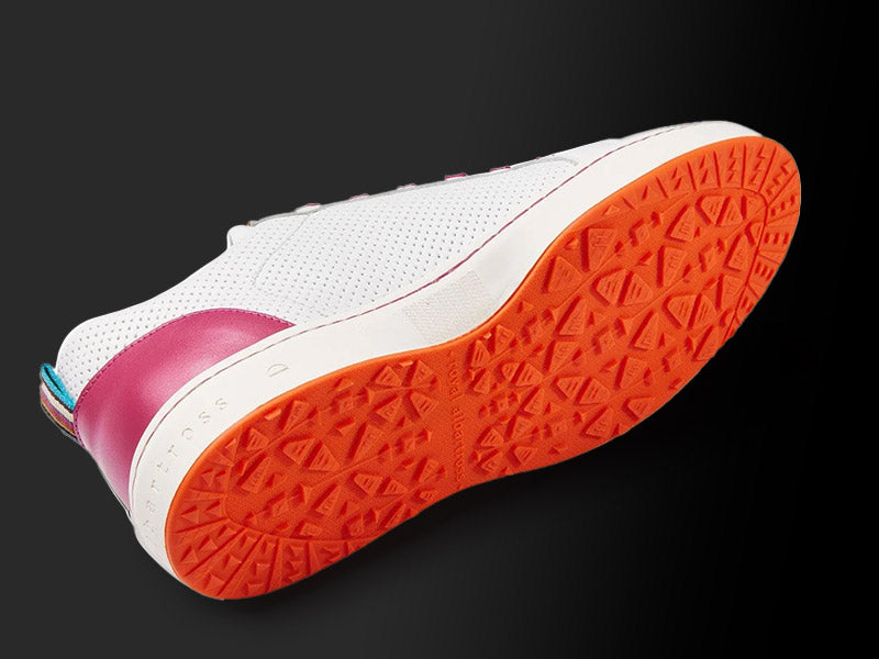 This season’s Amalfi golf sneaker has been given a fresh update in both style and comfort. We’ve enhanced the fresh white sneaker looks with a hot pink accent colour. The perforated white Italian leather uppers offer softness and climate control. The ultra-soft calf leather lining, extra padded ankle collar and spacious toe-box mean your comfort is always to the fore. Always attractive and forever fresh, this hot pink edition a must have style.