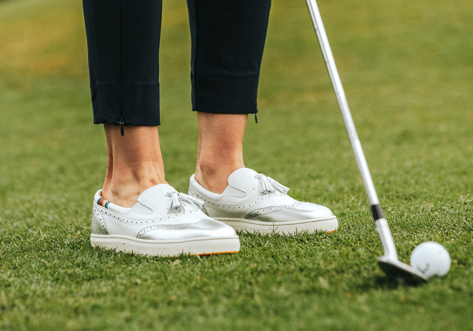 Sophistication and ease come together in this update to our best-selling Grace colour way, featuring interchangeable tassels for a fashion twist to match any outfit. Radiate grace on and off the course with our stunning slip-on loafer style shoe. The traditional classic wingtip design is enhanced by matching metallic silver accents, finished with our signature tassels. While soft calf lining, elasticated fitting, an extra padded ankle collar and spacious toe-box mean your comfort is always to the fore.